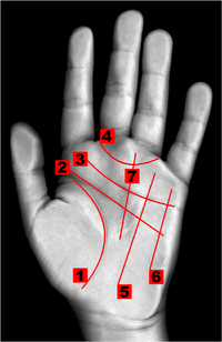1: Life line – 2: Head line – 3: Heart line – 4: Girdle of Venus – 5: Sun line – 6: Mercury line – 7: Fate line